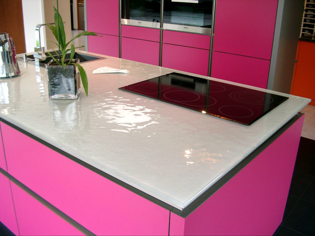 Schlicht, hygienisch und pflegeleicht sind Arbeitsflächen aus 12 mm dickem geätztem Glas. Spülbecken und Keramikkochfeld lassen sich genau gleich wie bei einer Steinplatte auf verschiedene Arten einbauen.